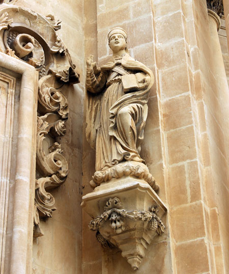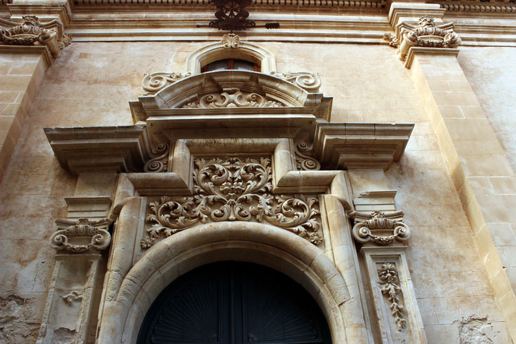 Chiesa di San Giuseppe (Church of St. Joseph) stands on Piazza Pola at the place of the earlier church of St. Thomas destroyed by the earthquake. It was built in the late 18th century by Benedictines from the nearby monastery. Like many other Ibla’s churches and palaces, the church of St. Joseph was designed by the famous architect Rosario Gagliardi. The façade with its columns, numerous sculptures and rich ornamentation represents the style of Sicilian Baroque. The belfry on the top of the façade holds three bells. The statues on both sides of the entrance door portray St. Gregory the Great and St. Augustine while others represent Saints worshipped by the Order of Benedictines (St. Benedict, St. Mauro, St. Gertrude….). The large window above the entrance is covered by a decorative wrought iron grate (work of Philip Scattarelli).