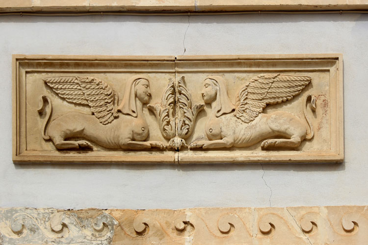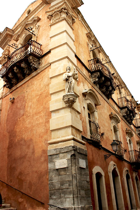 Palazzo Cosentini located on the corner of Ascent Commander (stairway) and Corso Mazzini was built by Sicilian Baron – Raffaele Cosentini and his son Joseph in a period of 1760’s -1770’s. It attracts attention due to its beautifully decorated baroque façade and strikingly profuse balconies. The latter are some of the best examples of Sicilian decorative art of those times. Each of balconies is a piece of art on its own and a story to be told to and impress passersby. It’s seems to be the way that aristocracy was reaching-out to the outside world, showing symbols of lavish abundance and wealth. Based on animated figures serving as corbels and carved scenes, some balconies “gained” names. For example the “Balcony of the Storyteller” took its name thanks to figures of “wanderers” and musicians, in other words “storytellers” that at those times were moving from place to place to “spread-the-news” and entertain public. The “Balcony of Gentleman” gained its name due to carved figures of “everyday life”(“normal”), shown without typical twists of “mockery” and correspondingly the “Balcony of Slander” thanks to “ugliness” of carved creatures.