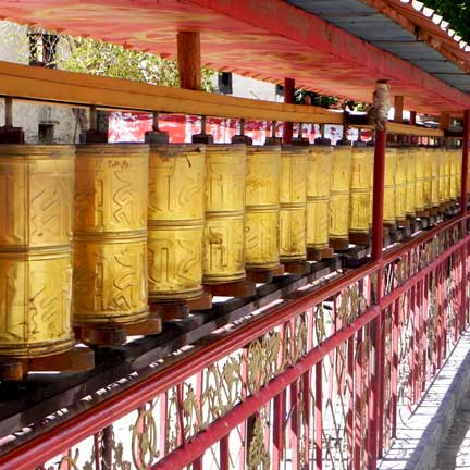 Wall of prayer wheels at the entrance to the Kumbum Chorta.