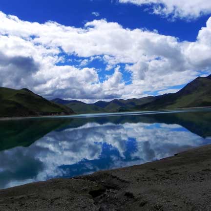 The sky feels to be closer here than ever before as the tranquil waters of the Yamdrok Lake perfectly reflect the firmament.