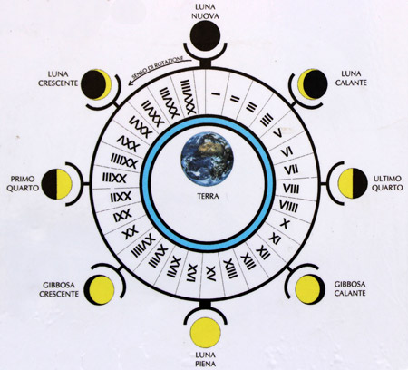 Moon Clock (lower disc): The main arrow indicates the time in the scale of the Lunar month which counts approximately 29 days 12 hours 44 minutes and 3 seconds. It also indicates the four basic phases of the Moon. To make it clear – the lunar month is defined as the period of time needed by the Moon to complete its full cycle (all phases). In more descriptive way the lunar months includes approximately 1 days of the New Moon (invisible Moon) followed by the First Quarter (14 days of Crescent Moon moving towards the Full Moon) and 1 day of the Full Moon followed by the Last Quarter (Waning Moon moving towards the New Moon).